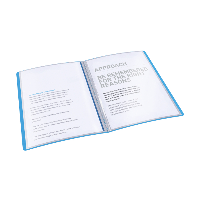 Mäkká katalógová kniha vo sviežich farbách a štvorčekovanom designe Vivida. Vyrobená z priehľadného polypropylénu hrúbky 0,36 mm. Ideálna pre prezentáciu či uloženie dokumentov, ktoré sú vystavené častému prezeraniu. 40 integrovaných obalov pre prezentáciu dokumentov. Zaujímavý povrch s embosovaným vzorom príjemným na dotyk. Samolepiaci chrbtový štítok v designe radu VIVIDA. Kapacita: 80 listov formátu A4 (80 g/m2), 2 listy / 1 obal. Farba modrá.