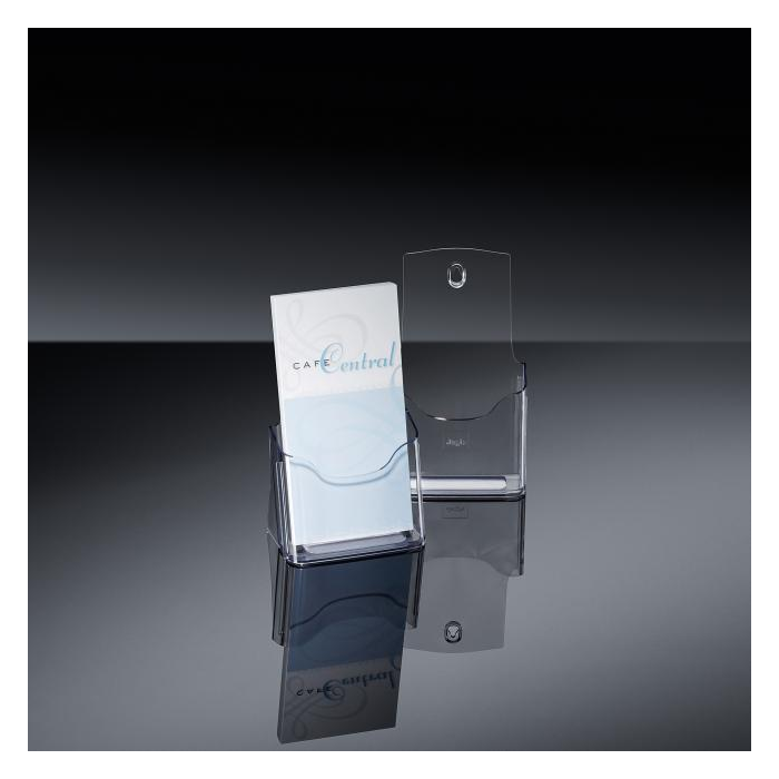 Stolný stojan s jedným odkladačom unikátneho dizajnu z vysokokvalitného akrylu. Ideálny na brožúry, katalógy a letáky. Hĺbka odkladača 30 mm. 25-ročná záruka na odolnosť voči UV žiareniu. Rozmery 125 × 200 × 75 mm. Farba číra.
