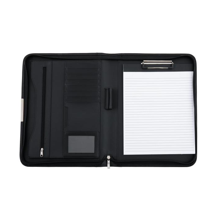 Konferenčná mapa so zipsom, vybavená písacou podložkou, vreckami na dokumenty a vizitky, úchytmi na písacie potreby a linajkovým poznámkovým blokom. V prevedení imitácie kože, úprava matná. Šírka chrbta 35 mm.