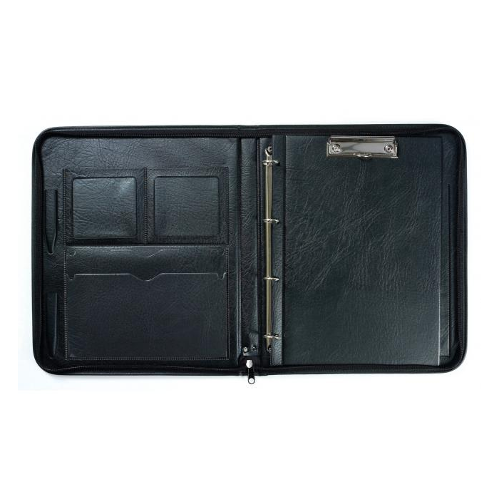 Konferenčná mapa so zipsom, vybavená 4-krúžkovou mechanikou, vreckami niekoľkých veľkostí, vložkami na vizitky a CD, úchytmi na písacie potreby a vyberateľnou písacou podložkou s klipom. Prevedenie imitácia kože Hanibal. Šírka chrbta 35 mm.