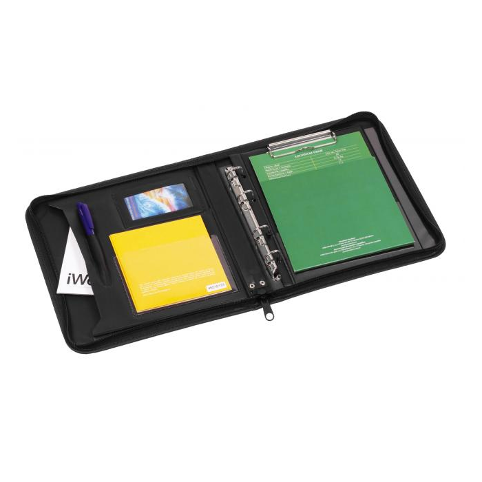 Konferenčná mapa so zipsom, vybavená 4-krúžkovou mechanikou D20, vreckami niekoľkých veľkostí na dokumenty, CD a pod. a podložkou s klipom. V prevedení imitácie kože, úprava matná. Šírka chrbta 40 mm, formát A5.