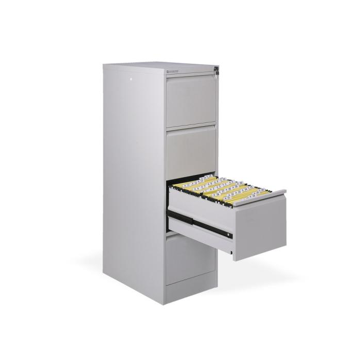 Celokovová kartotéka určená na zkladanie dokumentov A4 v závesných obaloch. Presné teleskopické vedenie na guličkových ložiskách pre ľahký a tichý chod zásuviek, zariadenie proti preváženiu (nemožno vysunúť viac zásuviek súčasne), vyvŕtané otvory pre prípadné spojenie s ďalšou kartotékou v rade. Zaťaženie zásuvky 40 kg, centrálne uzamykanie, mechanizmus zabraňujúci vypadnutiu zásuvky. Vnútorný rozmer zásuvky (š x v x h) 325x245x530 mm. Hladká povrchová úprava vypaľovaným lakom v sivom odtieni RAL 7035.