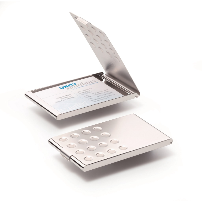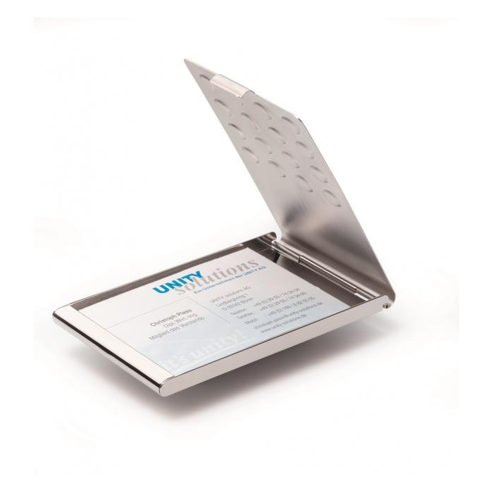 Elegantná pochrómovaná krabička na vizitky. Vnútorné rozmery 95 × 58 mm. Kapacita 20 vizitiek. Lesklá úprava. Farba strieborná.