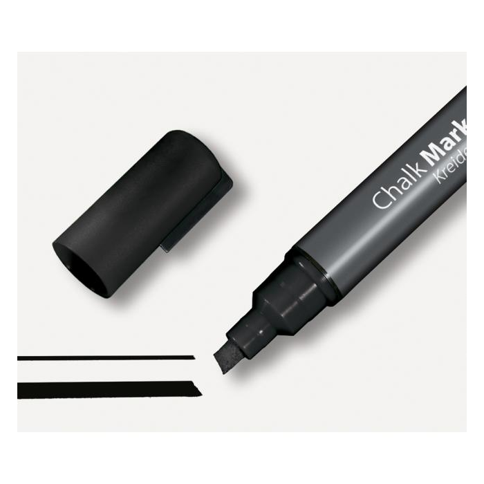 Ľahko stierateľné a vysoko nepriehľadné kriedové popisovače vhodné na sklenené tabule a všetky hladké povrchy podobné sklu. Zrezaný hrot hrúbky 1 - 5 mm. Vodeodolný atrament je zmazateľný vlhkou alebo suchou utierkou. Farba čierna.