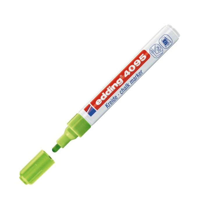 Tekutá krieda na báze vody. Popisovač určený na návrhy, dekorácie a značenie na sklo, okná, tabule a iné nepórovité povrchy. Okrúhly hrot, bez zápachu, zmazateľný vlhkou handričkou z takmer všetkých nepórovitých povrchov. Farba neónovoružová. Väčšie balenie 10 ks. Farba svetlozelená.