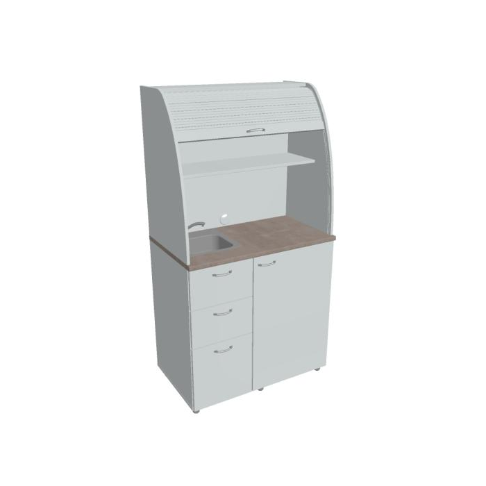 • Dve police vo vrchnej časti kuchynky poskytujú dostatočnú kapacitu na poháre, šálky a taniere. Na pracovnú dosku môžete umiestniť napr. kávovar a káblovou priechodkou v zadnej časti vyvediete kábel z priestoru kuchynky.