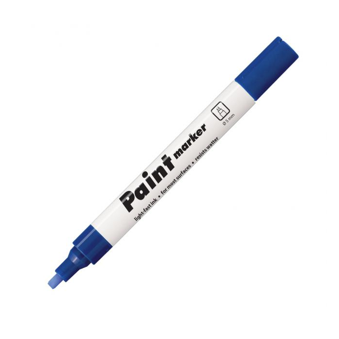 Lakový popisovač vhodný na neporézne povrchy. Svetlostály atrament po zaschnutí odolá vode, poveternostným vplyvom aj oderu. Hrot zrezaný, šírka stopy 1 - 5 mm. Väčšie balenie 10 ks v jednej farbe. Farba modrá.