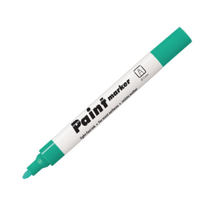 Lakový popisovač vhodný na neporézne povrchy. Svetlostály atrament po zaschnutí odolá vode, poveternostným vplyvom aj oderu. Hrot zrezaný, šírka stopy 1 - 5 mm. Väčšie balenie 10 ks v jednej farbe. Farba zelená.