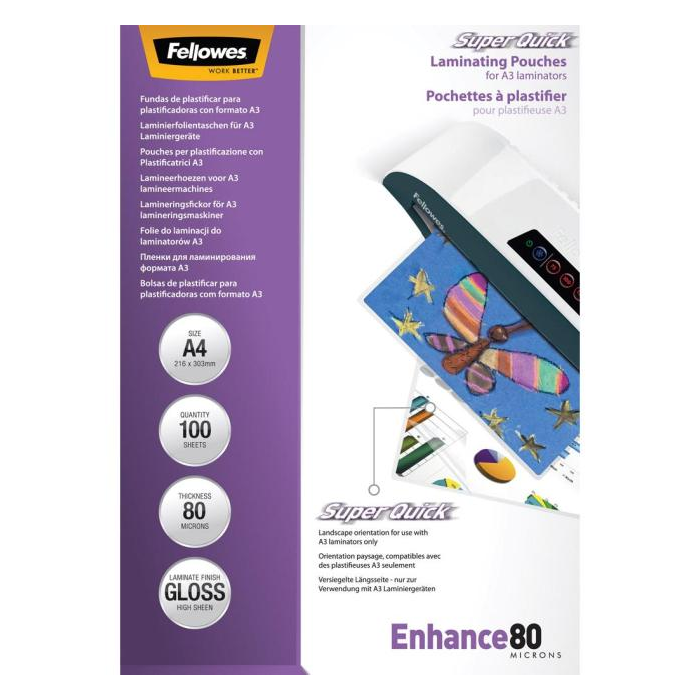 Lesklé laminovacie fólie, ktoré vďaka zataveniu na dlhšej strane skracujú čas potrebný na zalaminovanie o 40 % v porovnaní so štandardnými fóliami, zatavenými na kratšej strane. Laminácia možná iba na A3 laminátore. Formát A4, hrúbka 80 mikrónov. V balení 100 ks.