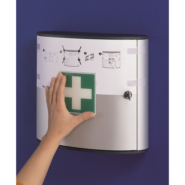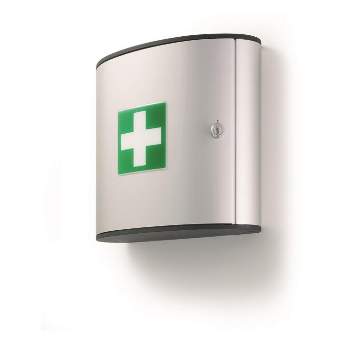 Malá lekárnička prvej pomoci v dizajne skriniek na kľúče. Dvierka, otvárajúce sa z dôvodu lepšej obsluhy v 180° uhle, 2 priehradky na základné lieky, obväzy, náplaste a nožnice. Materiál vysokokvalitný hliník. Dodávaná bez náplne s montážnou sadou na stenu.
