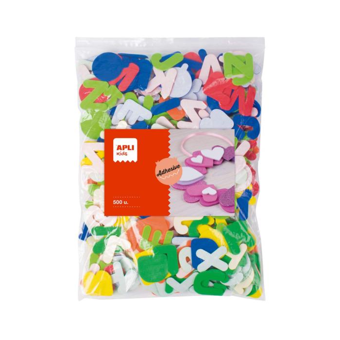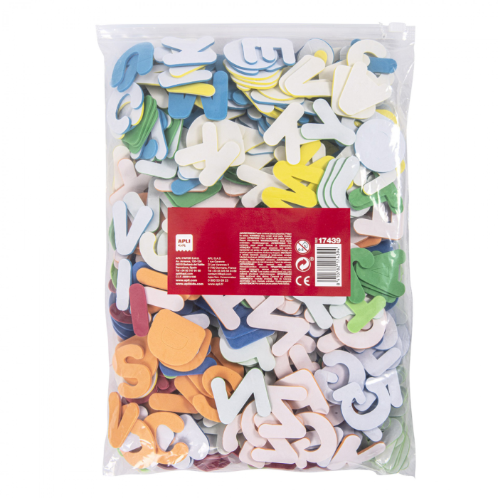 Písmená z peny EVA v rôznych farbách: žltá, oranžová, červená, svetlomodrá, modrá, svetlozelená a zelená. Každý tvar má približnú výšku 32 mm. Každé vrecko obsahuje 500 tvarov. MAXI formát, ideálny pre školy a skupiny. Ideálne na použitie doma alebo v škole na ručné práce, do albumov, na blahoželania atď. Vynikajúca pomôcka pre najmenšie deti, aby sa začali oboznamovať s písmenami abecedy a tvorili slová z mäkkého a bezpečného materiálu.