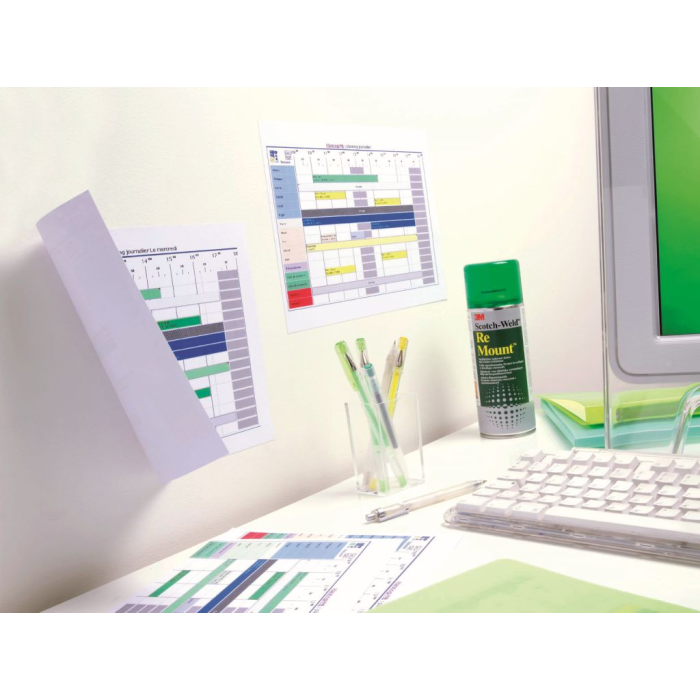 - 3M™ ReMount™ je odnímateľné lepidlo so špeciálnym zložením určené na dočasné umiestnenie materiálov.