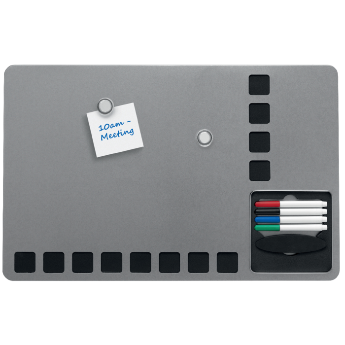 Kombinovaná tabuľa Rexel Combination Board s viacúčelovým a moderným bezrámčekovým dizajnom. Strieborný magnetický popisovací povrch s čiernymi penovými štvorcami pre upevnenie poznámok. Zabudovaný priestor pre uloženie 4 popisovačov a mazacej huby. Obsahuje štyri popisovače Rewritable (červený, modrý, čierny a zelený), montážne magnety a penovú lepiacu pásku. Veľkosť 610 × 390 mm.