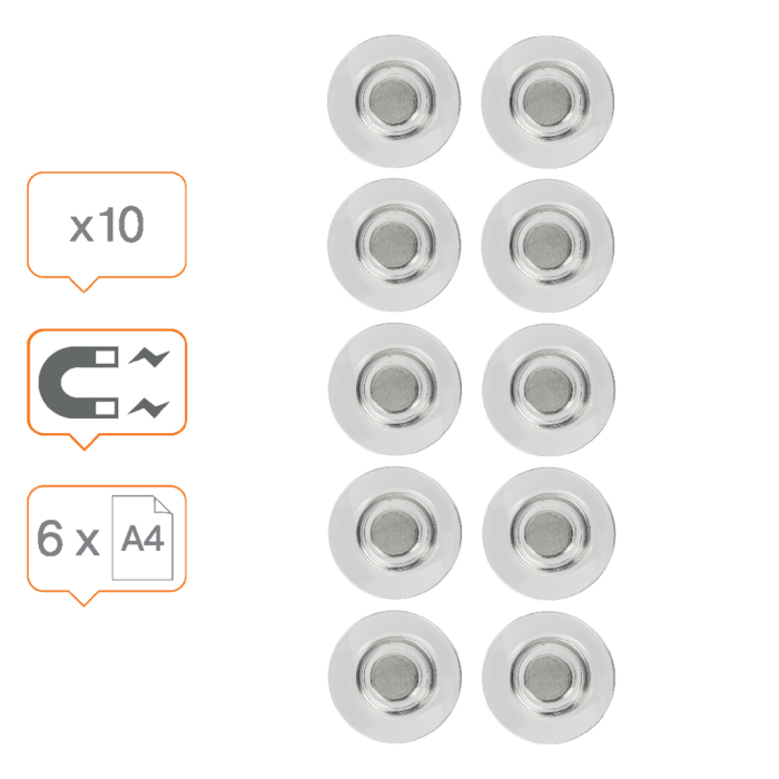 Prezentujte pripomienky a poznámky v kancelárii úhľadne a bezpečne. Magnety zo vzácnych zemín majú veľkú prídržnú silu, ktorá umožňuje upevniť až 6 listov papiera na akýkoľvek magnetický povrch, napríklad na popisovacie tabule, kartotéky alebo nástenky. Balenie: 10 kusov.