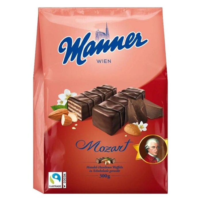 Jemné oblátky s mandľovou chuťou a jemnou tmavou čokoládou vyrobené z pražených kakaových bôbov Manner.