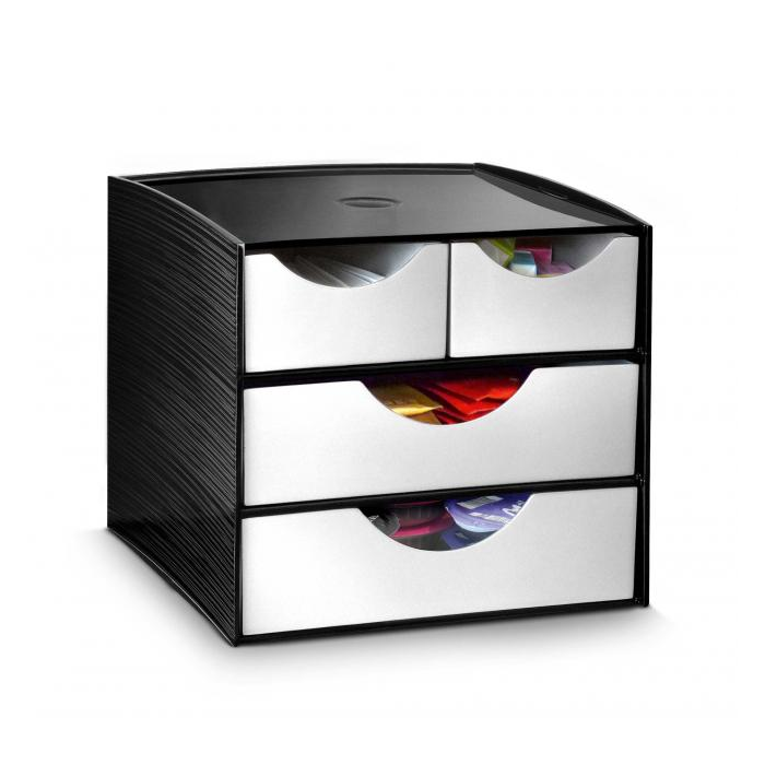 Geniálne navrhnutý a veľmi kompaktný modul so zásuvkami, ktorý si ľahko nájde svoje miesto v priestore Vašej kuchyne vedľa kávovaru alebo rýchlovarnej kanvice. Káva, smotana do kávy, čajové vrecúška, lyžičky, porciovaný cukor a papierové obrúsky nikdy neboli tak dobre organizované, aby uľahčili prípravu teplých nápojov. Rukoväte uľahčujú jednoduché otváranie zásuviek, zásuvky môžu byť v prípade potreby z modulu ľahko odstránené. Protišmykové podložky na spodnej časti modulu zabezpečujú jeho stabilitu. Vyrobený zo 100% recyklovateľného polystyrénu, ktorý je certifikovaný na bezpečnosť pre potraviny. Farba čierna/ kovová sivá. Rozmery (š × h) 185 × 183 mm, výška modulu 168 mm.