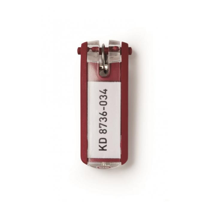 Inovované menovky na kľúče z vysokokvalitného plastu vnášajú do skriniek poriadok a systém a rušia chaos pri doterajšom skladovaní kľúčov. Kľúče visia pod menovkou, a tým je text na menovke zo všetkých strán viditeľný. Výrobu štítkov na menovky je možné voľne stiahnuť z internetovej adresy www.durable.de. Balenie 6 ks. Farba: červená