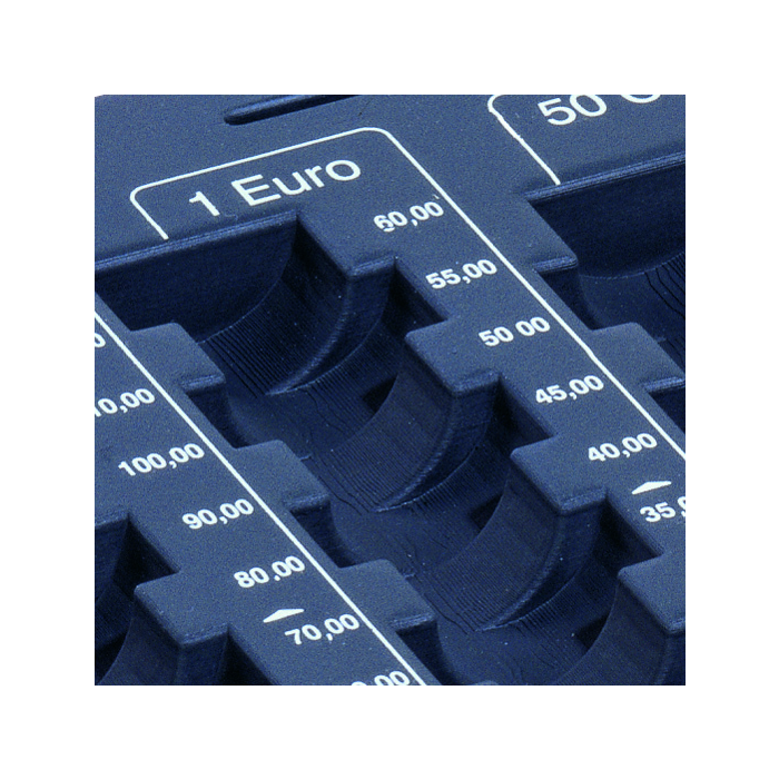 Samostatná mincová priehradka z tvrdého plastu, rozmerovo vhodná do bežnej stolovej zásuvky. Osem oddielov na eurá a centy v maximálnej hodnote 233,90 Euro, priehradka na bankovky, poukážky alebo stravné lístky vo vrchnej časti.