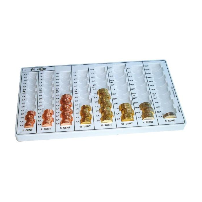 Samostatná mincová priehradka z plastu. Zo spodnej strany zabezpečená proti kĺzaniu štyrmi gumovými nožičkami. Rozmerovo vhodná do bežnej stolovej zásuvky. Maximálna kapacita obnosu 246,40 Euro. Rozmery: 328 x 32 x 178 mm