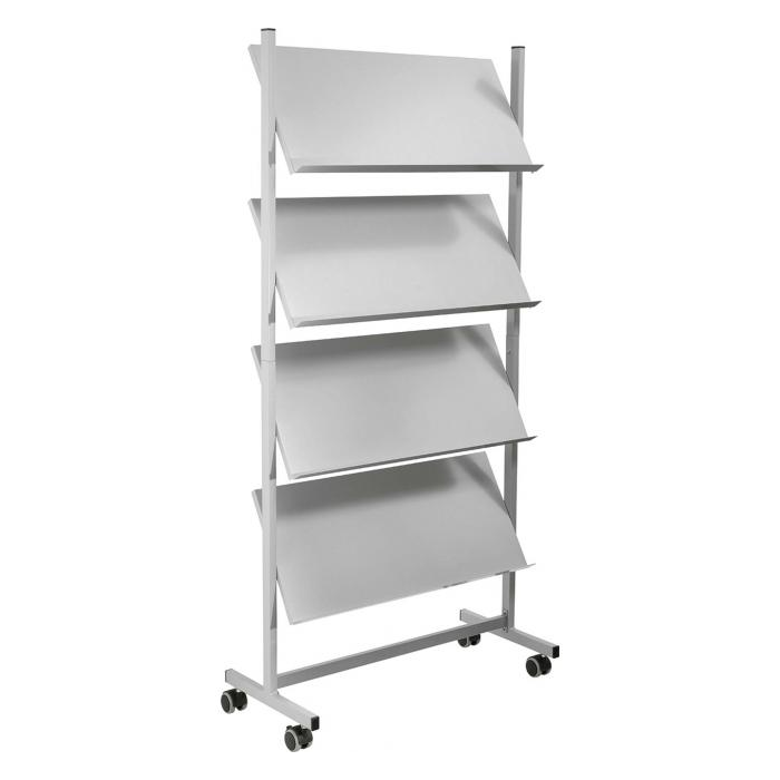 Vysoko kvalitný elegantný a pevný mobilný prezentačný stojan na časopisy alebo katalógy formátu A4. Dodávaný v rozloženom tvare. Materiál kov. Farba svetlosivá/ čierna. Štyri police s možnosťou fixácie v 3 sklonoch na max. 12 × A4 formátov. Rozmery (š × v × h) 750 × 1 570 × 360 mm.