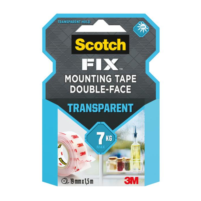 Transparentná obojstranná montážna páska, odolná voči vode a UV žiareniu. Nosnosť 2 kg na 30 cm pásky. Použitie na: sklo, dlaždice, akryl a kov. Väčšie balenie 12 ks. Rozmery 19 mm × 1,5 m.