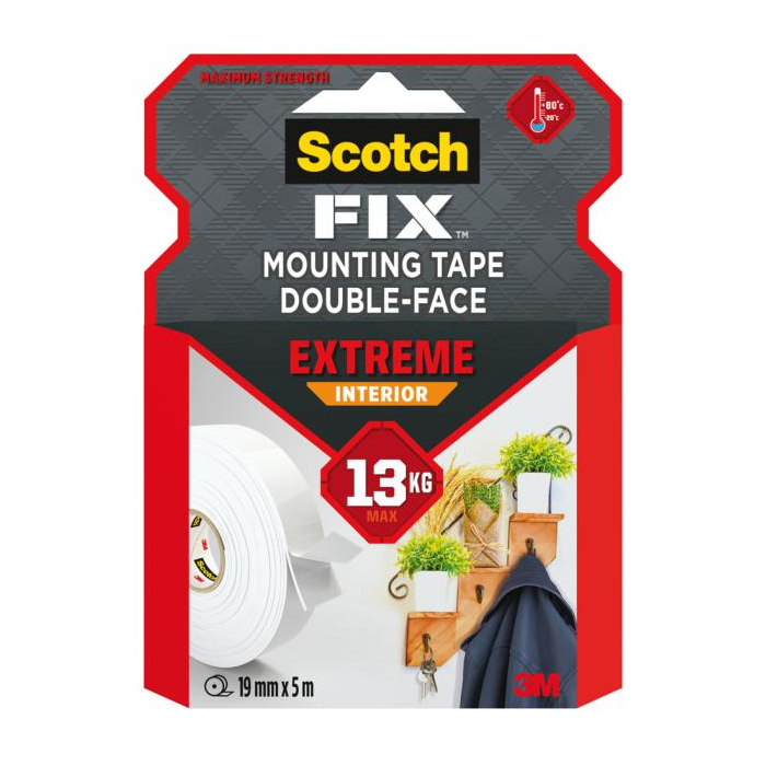 Supersilná montážna páska Scotch-Fix™ do interiéru s pokročilou technológiou 3M™. Táto vysoko kvalitná, prispôsobivá permanentná páska s nosnosťou do 13 kg je určená na extrémne použitie v interiéri a ako jediná montážna páska je vhodná aj na plasty, vrátane tvrdých plastov, ako napríklad PP a PE. Taktiež je ideálna na kovy, hladké a lakované/maľované povrchy a drevo. Rozmery 19 mm × 5 m.