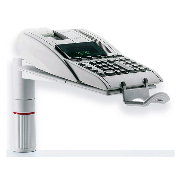 Malý otočný nosič telefónu. Výška nad pracovným stolom 15 cm, nosnosť 6 kg. Dĺžka ramena 21 cm. Dodávaný v štandardnej verzii na hrúbku stola 1,8 až 7,4 cm. Farba sivá. Farba: svetlosivá