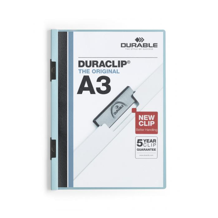 Obal vyvinutý spoločnosťou DURABLE pre viazanie nedierovaných listov. Materiál z PVC s unikátnym kovovým klipom, ktorý sa prispôsobí vloženému počtu listov a priehľadnou prednou stranou. Ideálny na prezentácie, ponuky, správy, poznámky na konferencie, semináre a pod. Formát A3 s dvomi klipmi. Kapacita 1-60 listov. Väčšie balenie 25 ks.