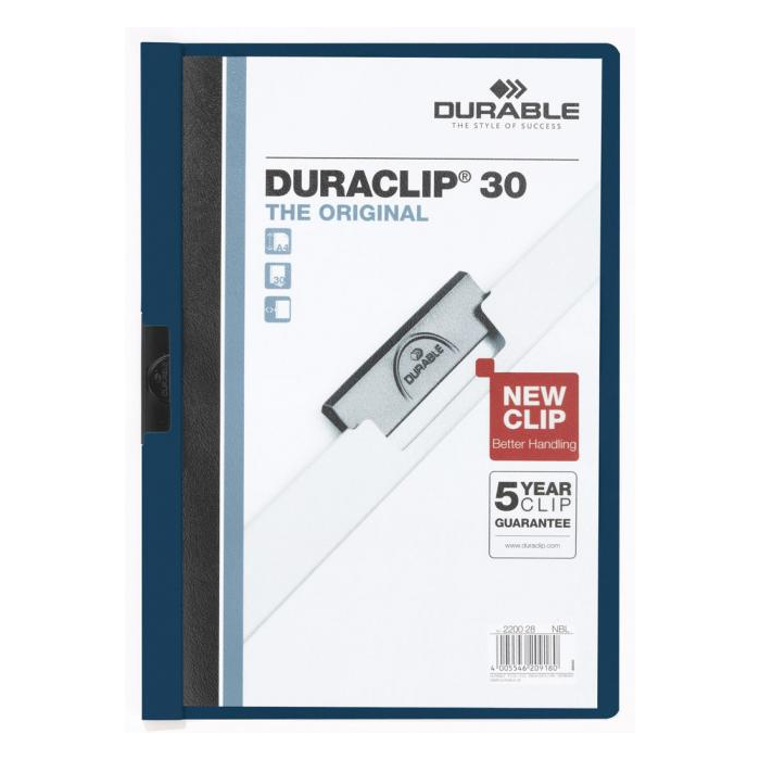 Obal vyvinutý spoločnosťou DURABLE pre viazanie nedierovaných listov. Materiál z PVC s unikátnym kovovým klipom, ktorý sa prispôsobí vloženému počtu listov a priehľadnou prednou stranou. Ideálny na prezentácie, ponuky, správy, poznámky na konferencie, semináre a pod. Formát A4. Kapacita 1-30 listov. Väčšie balenie 25 ks.