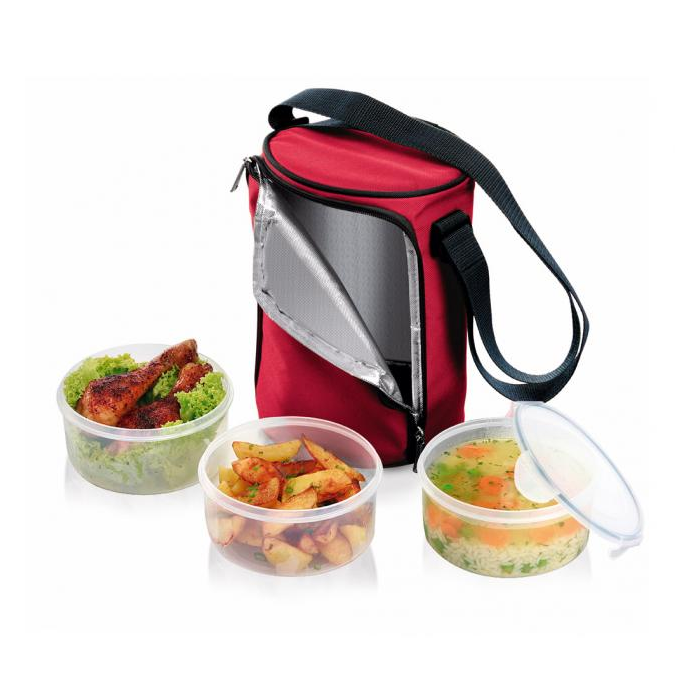 Pokrmy uložené v dózach v uzatvorenej termotaške si ďalej udržia svoju teplotu - zostávajú horúce alebo studené, pri prenášaní nevytekajú. Dózy je možné použiť aj samostatne na skladovanie potravín v chladničke, mrazničke a ohrievanie pokrmov v mikrovlnnej rúre, sú vybavené vodotesným aj vzduchotesným uzáverom. Materiál odolný plast s kvalitným silikónovým tesnením, odolný od −18 do +110°C. Vhodné do umývačky. Taška s nastaviteľným popruhom a vreckom je vyrobená z kvalitnej polyesterovej textílie, vybavená účinnou termoizolačnou vložkou s alumíniovou fóliou. 5 rokov záruka.