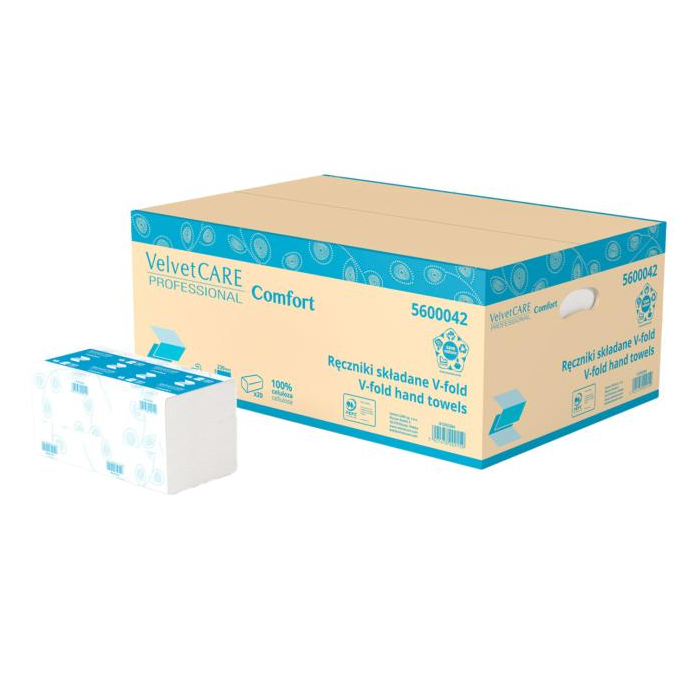 Mäkké, pevné a savé uteráky Velvet CARE Professional V Fold 23x23 cm - 100% celulóza, 2 vrstvy, 150 ks v balení, 3000 ks v kartóne (20x150 ks)