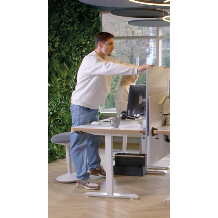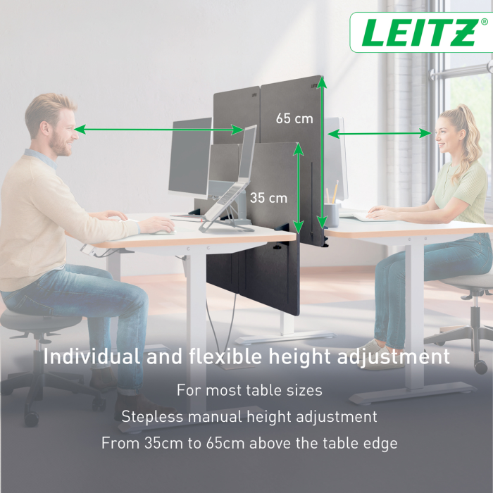 Medzery medzi doskou stola a deliacimi panelmi pre káble a ramená monitorov Leitz.