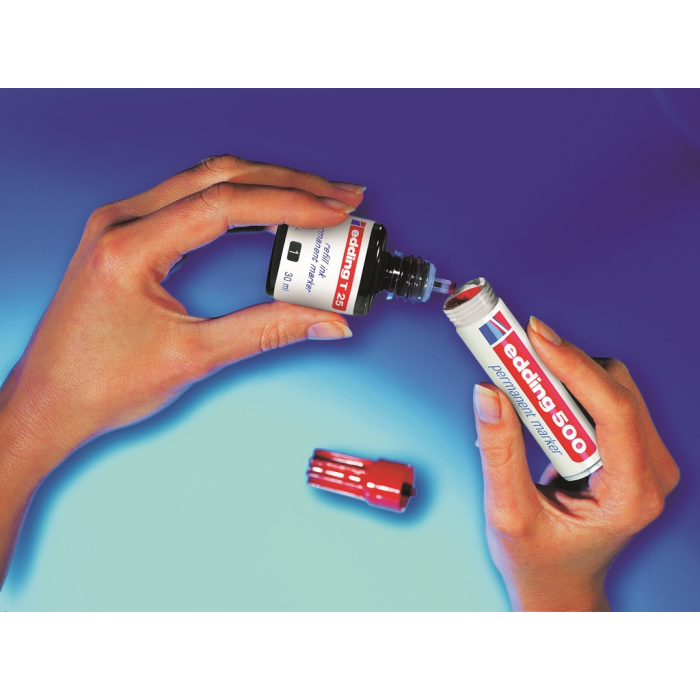 Popisovač s permanentným atramentom na popisovanie takmer na všetky materiály vrátane kovu, skla a umelých hmôt. Hliníkový obal. Hrot zrezaný, šírka stopy 2 - 7 mm. Dopĺňateľný atramentom edding T 25. Väčšie balenie 10 ks.