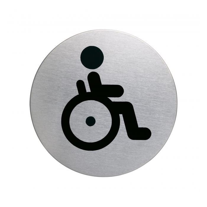 Piktogram na vysoko kvalitnej brúsenej nehrdzavejúcej oceli. Vytlačený symbol je odolný voči poškriabaniu a silnému opotrebeniu. Priemer 83 mm, vďaka lepiacej páske na zadnej strane sa piktogram dá použiť na rôzne povrchy. Farba strieborná, potlač čierna.