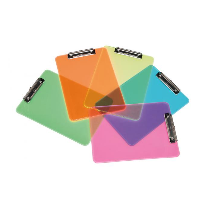 Písacia podložka A4 z priehľadného plastu v piatich neónových farbách s možnosťou zavesenia. Ľahko uchopiteľný silný plochý kovový klip s ochrannými plastovými rohmi. Rozmery 22,6 × 31,8 × 1,5 cm, hrúbka podložky cca 0,24 cm, kapacita klipu cca 0,8 cm, hmotnosť 0,198 kg. Podložka je recyklovateľná. Farba transparentná modrá.
