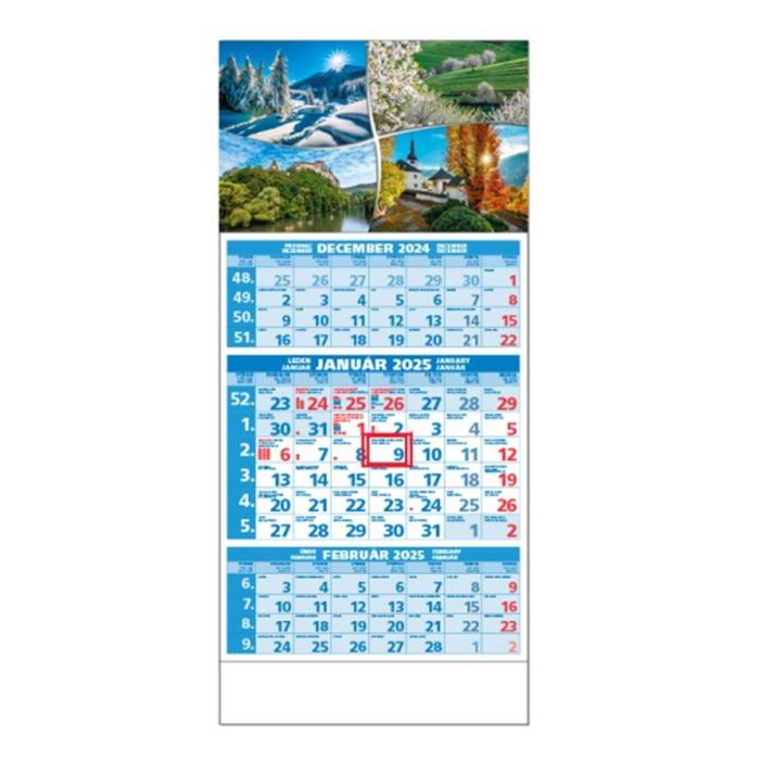 Plánovací kalendár s 3-mesačným kalendáriom s menami v SK + CZ, názvy mesiacov a dní v SK, CZ, EN, DE a HU