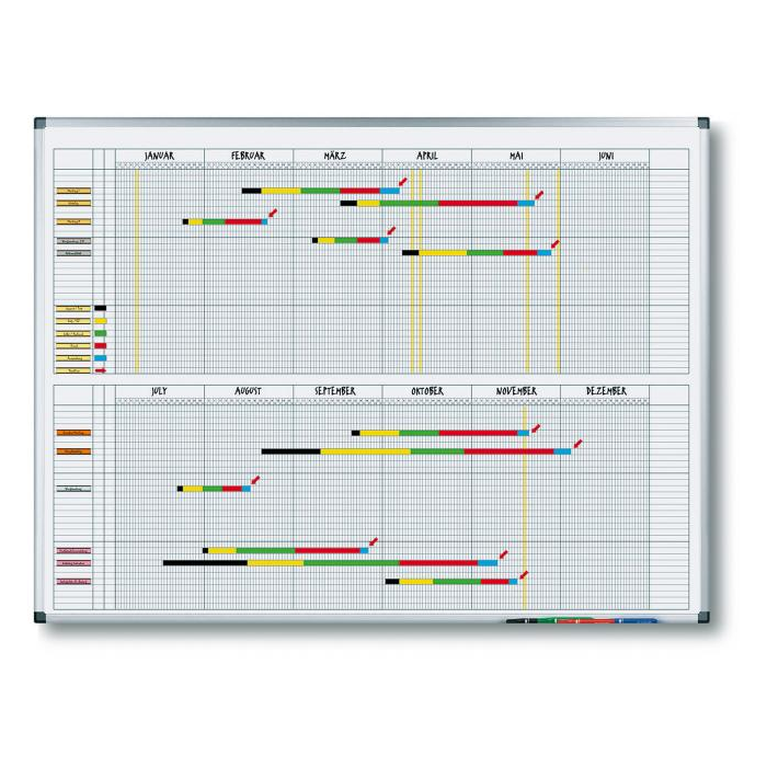 Ročný plánovač v dvoch častiach. Delenie do 365dňových okienok, 7 dní v týždni. Pre plánovanie do 33 ľudí/ objektov, ak je použitý ako 12mesačný plánovač a do 66 ľudí/ objektov, ak je použitý ako 6mesačný plánovač. Keďže nie sú predtlačené názvy mesiacov, plánovanie môže začať ľubovoľným mesiacom. Magnetický popisovateľný povrch. Sada príslušenstva obsahuje: 4 stierateľné popisovače TZ 111, 72 magnetických menoviek s bielymi štítkami a sadu 10 mm magnetických symbolov.