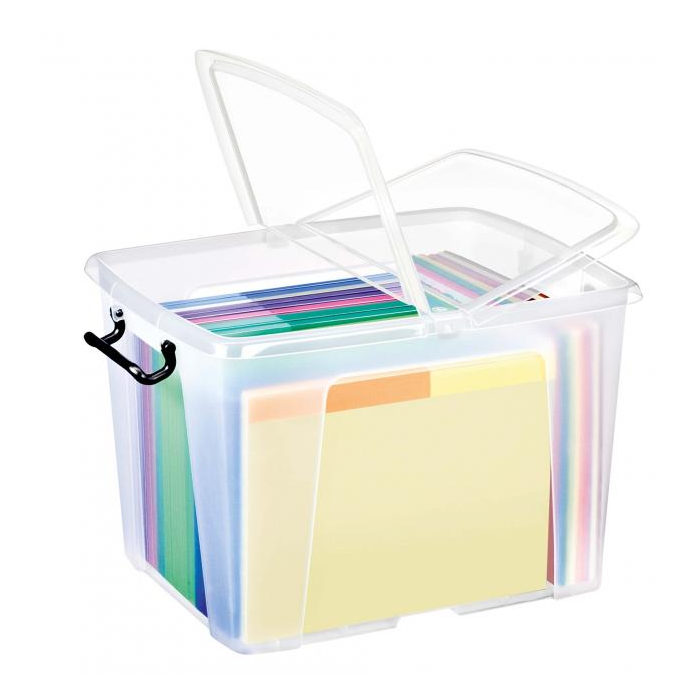Transparentný robustný multifunkčný box z plastu s vekom, stohovateľný pri nepoužívaní. Motýlie veko na otváranie z 2 strán z dôvodu ľahšieho prístupu, 2 pevné rukoväte slúžiace na prenos boxu a súčasne ako klip na pevné uzatvorenie boxu. Materiál recyklovaný PP. Objem 40 litrov, romery 50 × 39,5 × 32 cm (dĺžka, šírka, výška). Na tento produkt platí predĺžená záruka 5 rokov.