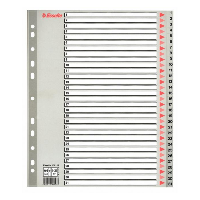 Číselný rozraďovač z polypropylénu. Eurodierovanie, popisovateľný kartónový titulný list na ľahkú orientáciu v dokumentoch. Formát A4 maxi rozmerov 245×297 mm umožňuje rozlíšenie dokumentov založených v zakladacích obaloch. Balenie jedna sada v po­lyesterovom sáčku. Väčšie balenie 10 sád. Farba sivá.