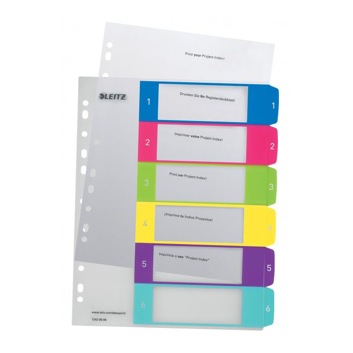 Opakovane použiteľný a extra odolný plastový číselný rozraďovač 1 - 6 v žiarivých farebných kombináciách s univerzálnou perforáciou. Materiál odolný polypropylén hrúbky 0,3 mm. Formát A4 maxi. Možnosť potlače na upravenie podľa vlastných potrieb, predloha stiahnuteľná zdarma na www.esselte.com/ easyprint.