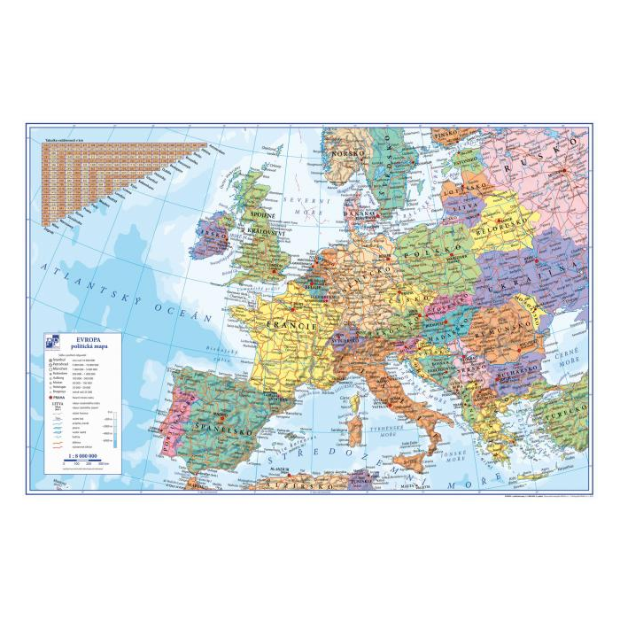 Mapa Európy pod zataveným transparentným obalom z PVC fólie. Postranné klopy na založenie odkazov a poznámok. Text v českej verzii.