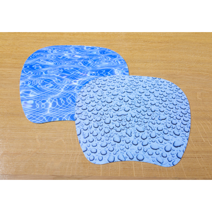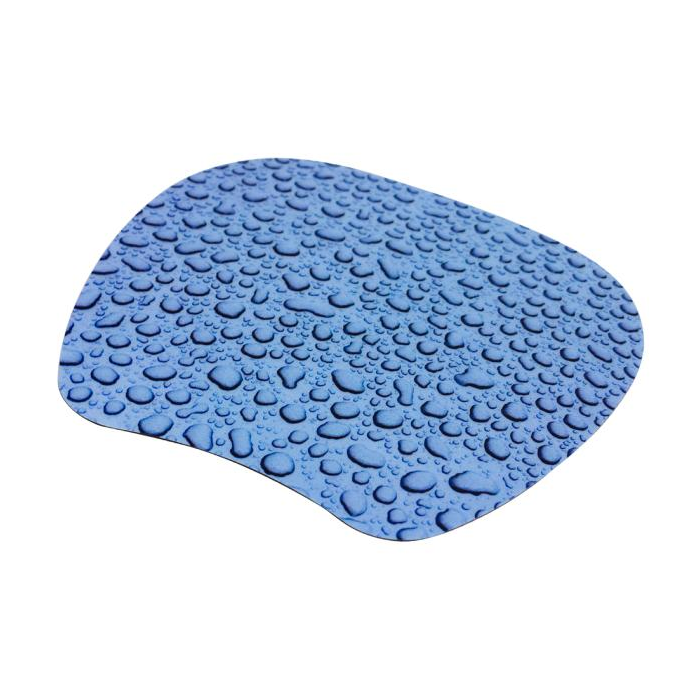 Podložka pod myš iba 1 mm hrubá. Vhodná pre optické myši. Rozmery 212 × 1 × 172 mm. Motív kvapka vody.