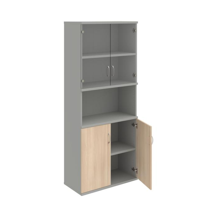 Kombinovaná skriňa - dvere/nika. Kancelárske skrine STRONG majú robustnú konštrukciu a vyššiu nosnosť políc ako bežné kancelárske skrine.V ponuke sú skriňové moduly s výškou 185 cm, 111 cm alebo 74 cm a šírky 80 cm alebo 40 cm. Hĺbka všetkých modelov skriňového radu STRONG je 40 cm.Chrbát, vyrobený z 8 mm hrubých dosák, je obojstranne pohľadový, takže skrine môžete použiť ako priestorový deliaci prvok. Hrúbka samotných políc je 25 mm, čo znamená nosnosť 80 kg na 1 policu.Korpusy, dvierka a police skríň sú olepené odolnou 2mm ABS hranou, ktorá garantuje dostatočnú ochranu proti poškodeniu.