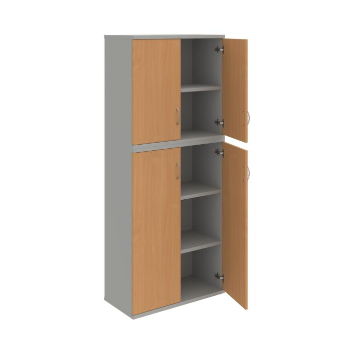 Kombinovaná skriňa - dvere/nika. Kancelárske skrine STRONG majú robustnú konštrukciu a vyššiu nosnosť políc ako bežné kancelárske skrine.V ponuke sú skriňové moduly s výškou 185 cm, 111 cm alebo 74 cm a šírky 80 cm alebo 40 cm. Hĺbka všetkých modelov skriňového radu STRONG je 40 cm.Chrbát, vyrobený z 8 mm hrubých dosák, je obojstranne pohľadový, takže skrine môžete použiť ako priestorový deliaci prvok. Hrúbka samotných políc je 25 mm, čo znamená nosnosť 80 kg na 1 policu.Korpusy, dvierka a police skríň sú olepené odolnou 2mm ABS hranou, ktorá garantuje dostatočnú ochranu proti poškodeniu.