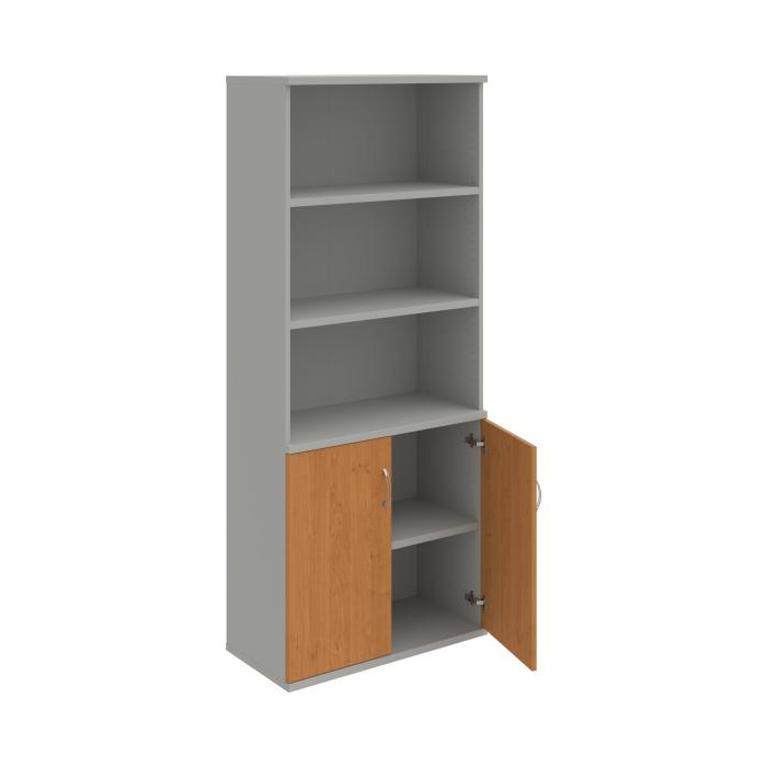 Kombinovaná skriňa - dvere/nika. Kancelárske skrine STRONG majú robustnú konštrukciu a vyššiu nosnosť políc ako bežné kancelárske skrine.V ponuke sú skriňové moduly s výškou 185 cm, 111 cm alebo 74 cm a šírky 80 cm alebo 40 cm.Hĺbka všetkých modelov skriňového radu STRONG je 40 cm.Chrbát, vyrobený z 8 mm hrubých dosák, je obojstranne pohľadový, takže skrine môžete použiť ako priestorový deliaci prvok. Hrúbka samotných políc je 25 mm, čo znamená nosnosť 80 kg na 1 policu.Korpusy, dvierka a police skríň sú olepené odolnou 2mm ABS hranou, ktorá garantuje dostatočnú ochranu proti poškodeniu.