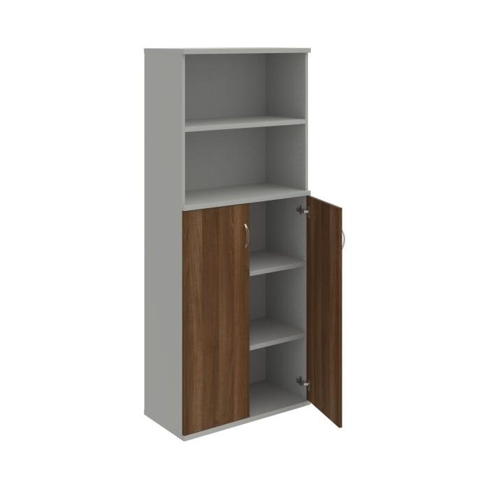 Kombinovaná skriňa - dvere/nika. Kancelárske skrine STRONG majú robustnú konštrukciu a vyššiu nosnosť políc ako bežné kancelárske skrine.V ponuke sú skriňové moduly s výškou 185 cm, 111 cm alebo 74 cm a šírky 80 cm alebo 40 cm.Hĺbka všetkých modelov skriňového radu STRONG je 40 cm.Chrbát, vyrobený z 8 mm hrubých dosák, je obojstranne pohľadový, takže skrine môžete použiť ako priestorový deliaci prvok. Hrúbka samotných políc je 25 mm, čo znamená nosnosť 80 kg na 1 policu.Korpusy, dvierka a police skríň sú olepené odolnou 2mm ABS hranou, ktorá garantuje dostatočnú ochranu proti poškodeniu.