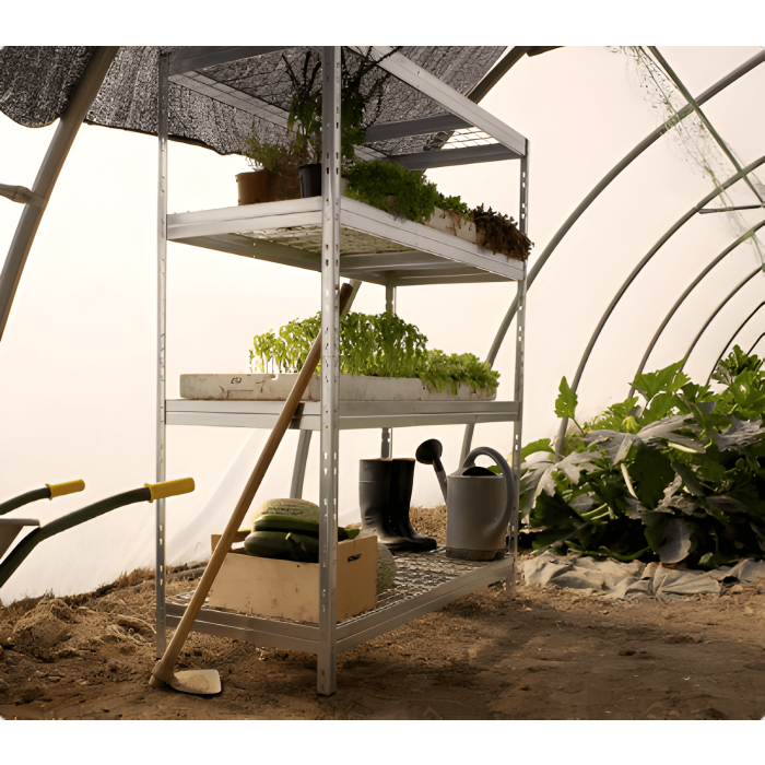 • Drôtené police pre lepšiu cirkuláciu vzduchu: 5 drôtených políc z valcovanej ocele s elektro-zváranou sieťou umožňujú optimálnu cirkuláciu vzduchu, čo je ideálne pre záhradkárstvo a prevenciu vlhkosti.