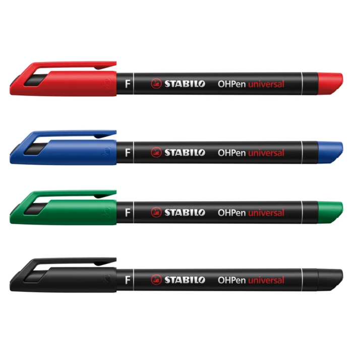 Permanentné popisovače na popisovanie takmer všetkých hladkých povrchov. Nekĺzavá úchytová zóna, praktický klip, bez vrchnáka vydrží až 3 dni. Väčšie balenie 10 ks v jednej farbe. STABILO® OHPen universal Fine (F) Hrot okrúhly, šírka stopy 0,7 mm. Farba čierna.