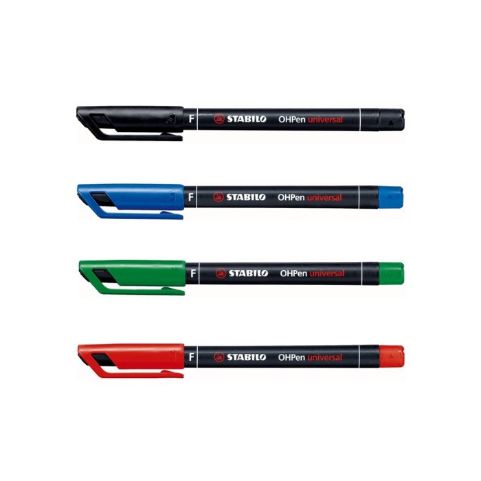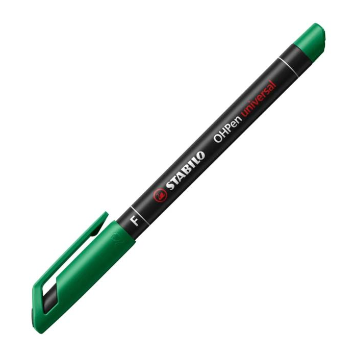 Permanentné popisovače na popisovanie takmer všetkých hladkých povrchov. Nekĺzavá úchytová zóna, praktický klip, bez vrchnáka vydrží až 3 dni. Väčšie balenie 10 ks v jednej farbe. STABILO® OHPen universal Fine (F). Hrot okrúhly, šírka stopy 0,7 mm. Farba zelená.