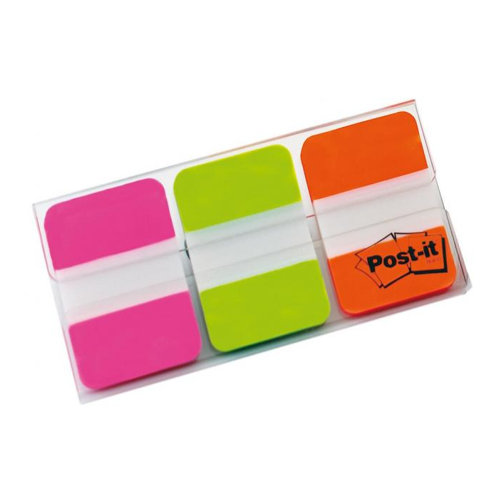 Plastové záložky s extra silnou priľnavosťou. Premiestniteľné, odstraniteľné a popisovateľné perom, ceruzkou alebo popisovačom. Rozmery 25 × 38 mm, v balení 3 × 22 ks záložiek. Neónové farby: ružová, zelená a oranžová.